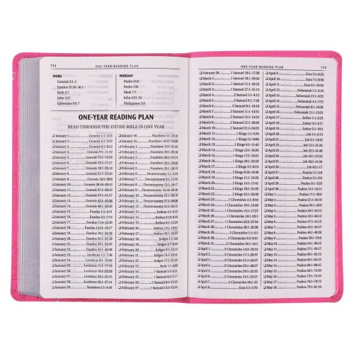 Experience the convenience of the Bible's lay-flat spine that allows it to open and lie flat on any surface. A presentation page is perfect for inscribing names and a date to mark a special occasion. Despite its lightweight and thin profile, this Bible features a small but legible 8-point type, presented in a double-column format, and includes the entire KJV text, a helpful thematic Scripture verse finder, and a comprehensive one-year Bible reading plan.