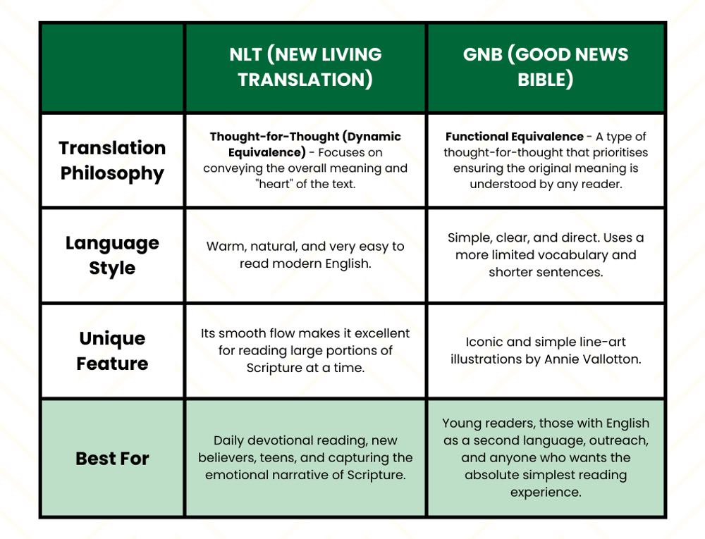 The main difference between the NLT and the Good News Bible (GNB) is their style: both are easy-to-read, "thought-for-thought" translations, but the NLT uses a natural, contemporary English flow, while the GNB uses a simpler, more controlled vocabulary, making it exceptionally clear for new readers.