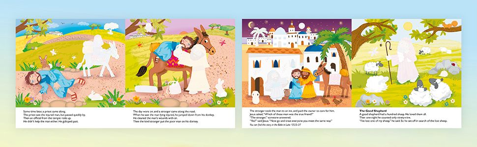 A charming re-telling of three best-loved Bible stories: The Good Stranger, The Good Shepherd and The Lost Son with clear and simple text and bright colourful stickers.